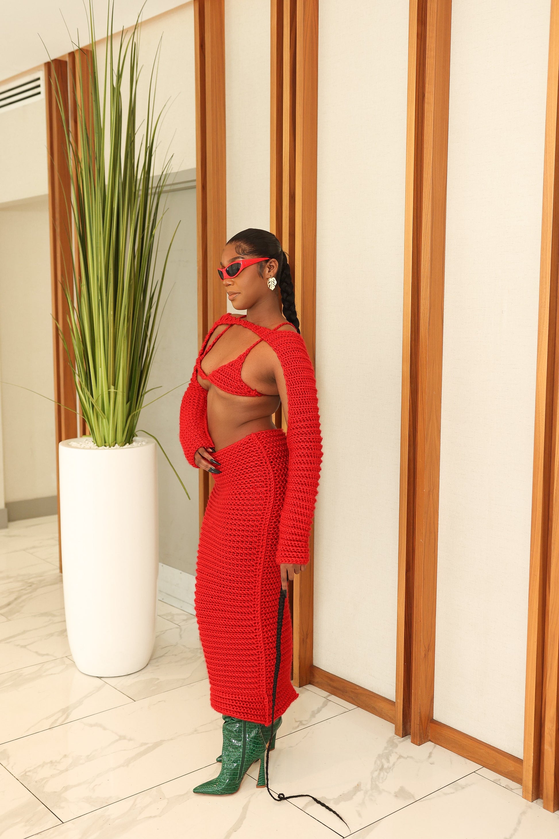 FREYA cause they can't handle the heat. She is made to flatter and accentuate your figure. She is the exemplar of strength and elegance. She features a long sleeves with a low waist long skirt, the bra cups were inspired by a seashell construction cuz remember the seashore? Pair her with the Freya bralette top/skirt for a nonstop stare.