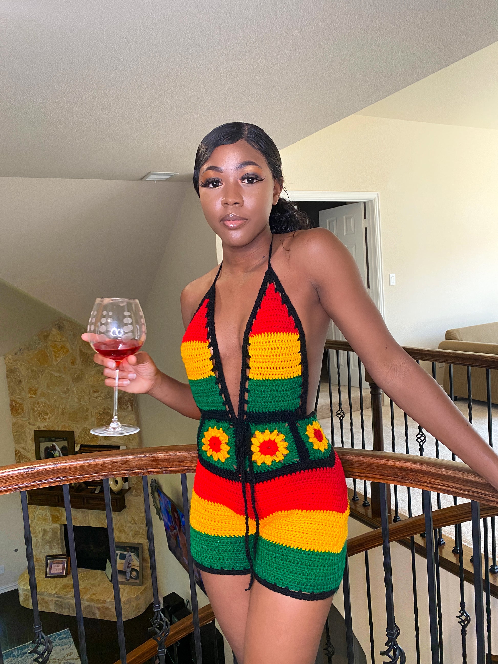 In the Jennifer Romper created and worn by Jennifer, the category is body! This sexy romper has a V-neckline, a striped pattern all over and adjustable shoulder straps cuz when are they playing? The waist is defined by our signature granny squares.