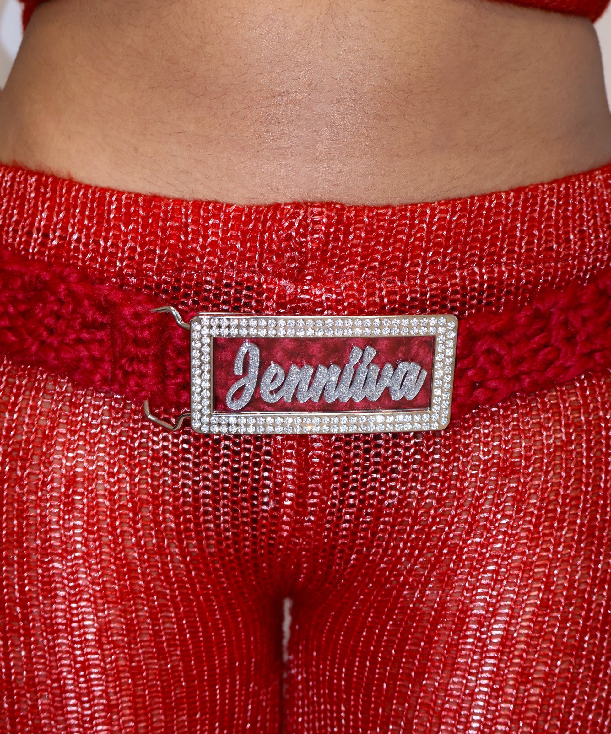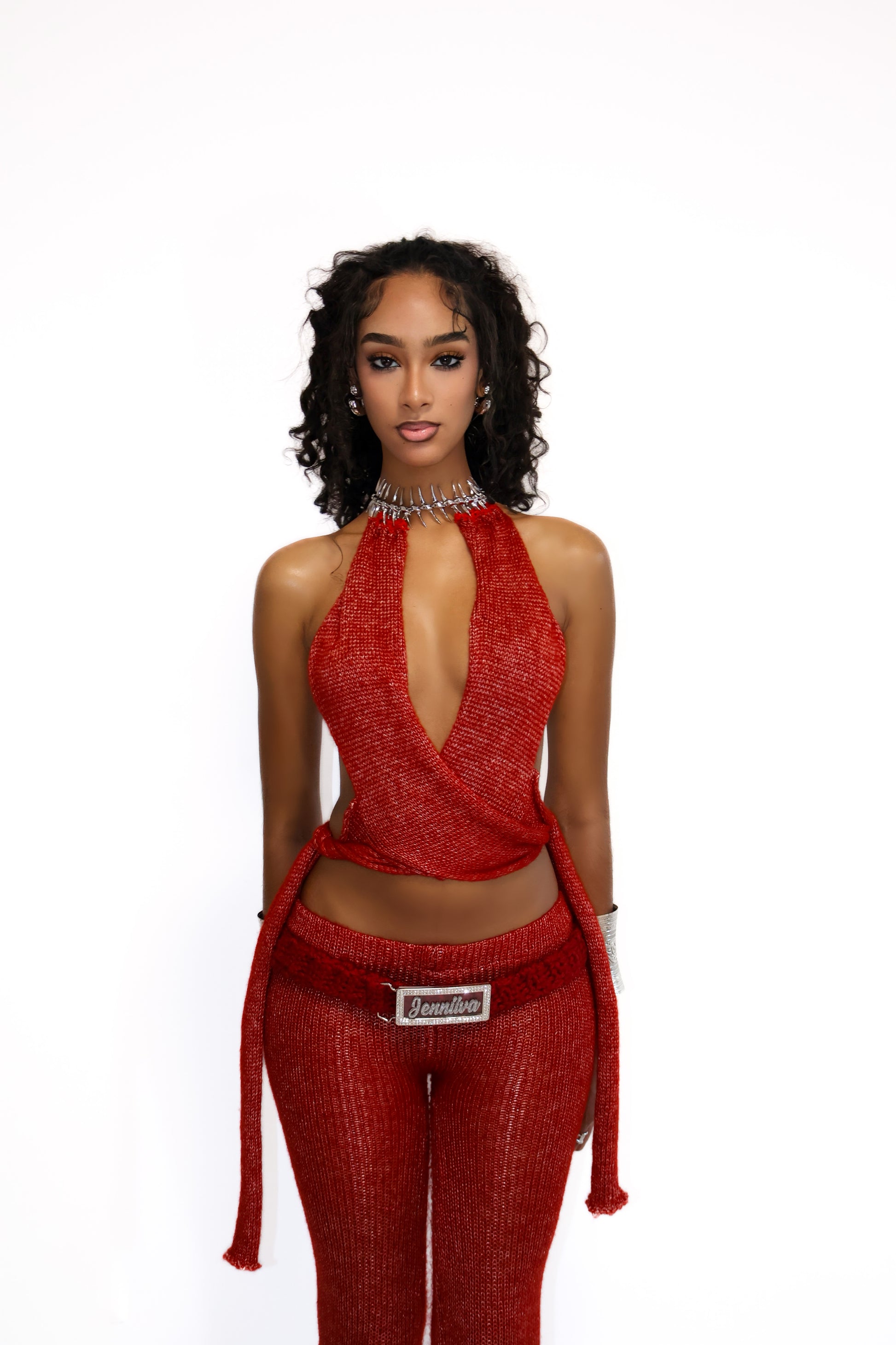 The Lailo Stirrup Pants redefine modern seduction with a flawless stretch-knit fit that moves like liquid fire. Featuring a signature Jenniiva belt and elegant stirrup detail, each element frames the body with precision and power. Finished in a lustrous red metallic yarn, these pants are more than a statement, they’re a declaration of desire and are perfectly paired with Lailo top.